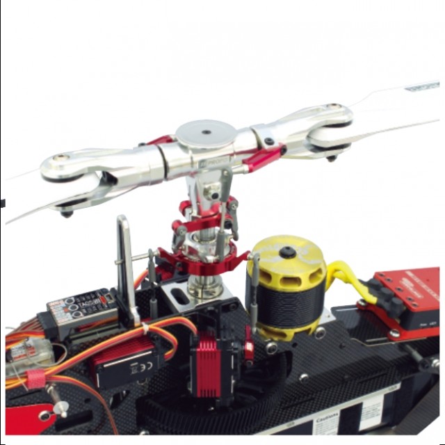 All components are positioned around the main shaft, and the servos have short, direct linkages to the swash plate. The rotor head spindle is 10mm, and the main shaft 12mm.