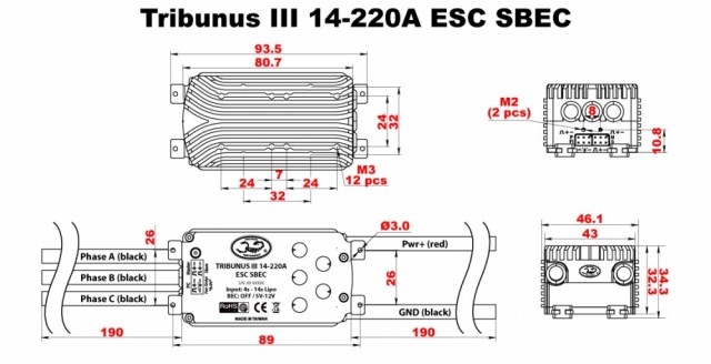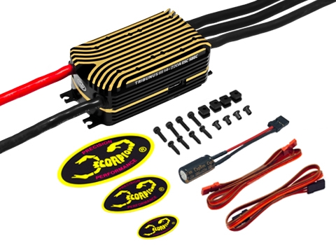 Scorpion Tribunus III 14-220A ESC SBEC Artikkelnr.: SCTRI3-14-220 Scorpion Tribunus III 14-220A ESC SBEC NOK5 495,00 Førpris:NOK6 095,00 Rabatt -10% inkl. mva. På lager: 1 stk. Antall Kjøp Ønskeliste Del dette Produktinfo Produktanmeldelser (0) Supports JR Propo Telemetry protocol. Thus perfect together with the Trinity gyro! Specifications Max Continuous Current* 220 Amps Peak Current 300 Amps Operating Voltage Range 13-61 Volts BEC Output voltage: OFF / 5.1V to 12.1V adjustable Max Continuous BEC Output 15 Amps @ 8.1 V Peak BEC Output 30 Amps/1s @ 8.1 V On Resistance 0.55mOhms*2 ESC Body Size 46.1 x 80.7 x 32.3 mm (1.81 x 3.17 x 1.27 in) Mounting Tab Dimensions 26.0 x 89.0mm ( 1.02 x 3.50 in) / M3 Bolt Weight (without wires) 194g ( 6.84oz) Weight (With wires) 294g ( 10.37oz) Drive frequency 8kHz - 32kHz Dynamic Frequency Cable size 8 AWG x 200mm Max Electrical RPM 240,000RPM *Max Continuous Current is the rating at 100% throttle for 60 seconds with 35m/s of airflow Included in the Box 1 x Tribunus III ESC2 x BEC Cables (410mm)1 x Mounting Hardware Pack1 x BEC Voltage Stabilizing Capacitor Skriv en produktanmeldelse og del dine erfaringer med dette produktet med andre kunder. Email Navn Din vurdering? 1 star 2 star 3 star 4 star 5 star 6 star Oppgi en tittel for anmeldelsen din Skriv inn produktanmeldelsen i feltet under